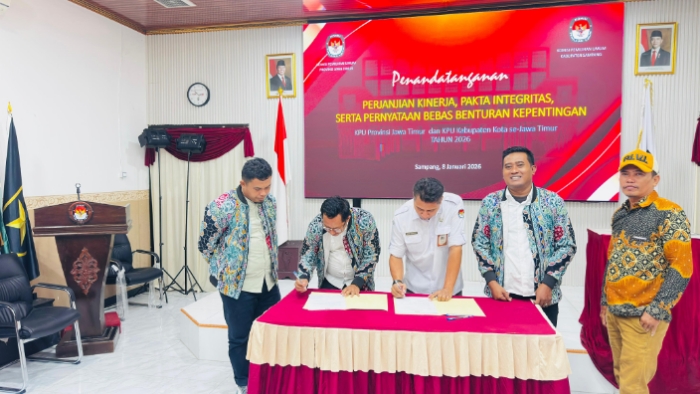 Prosesi penandatangan tersebut dilaksanakan secara serentak oleh KPU Provinsi Jawa Timur dan KPU Kabupaten/Kota se-Jawa Timur yang dilaksanakan secara daring melalui Zoom Meeting, Kamis (8/1/2026).