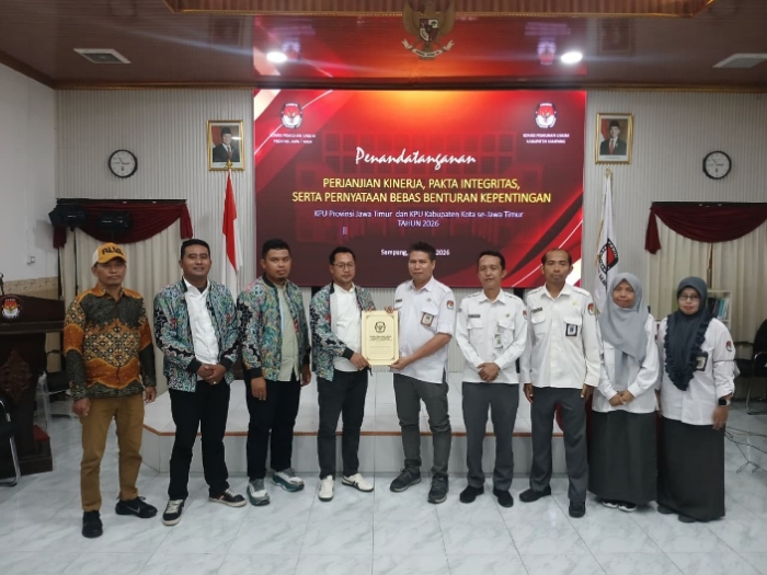 Prosesi penandatangan tersebut dilaksanakan secara serentak oleh KPU Provinsi Jawa Timur dan KPU Kabupaten/Kota se-Jawa Timur yang dilaksanakan secara daring melalui Zoom Meeting, Kamis (8/1/2026).
